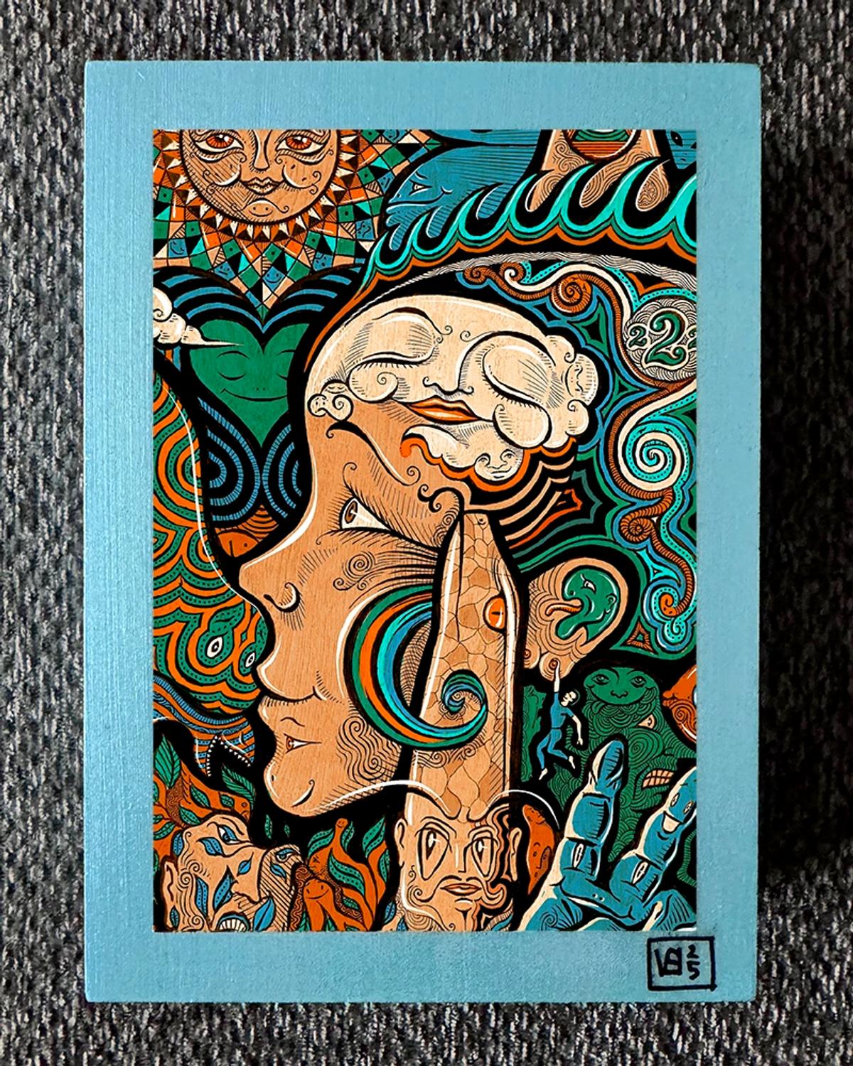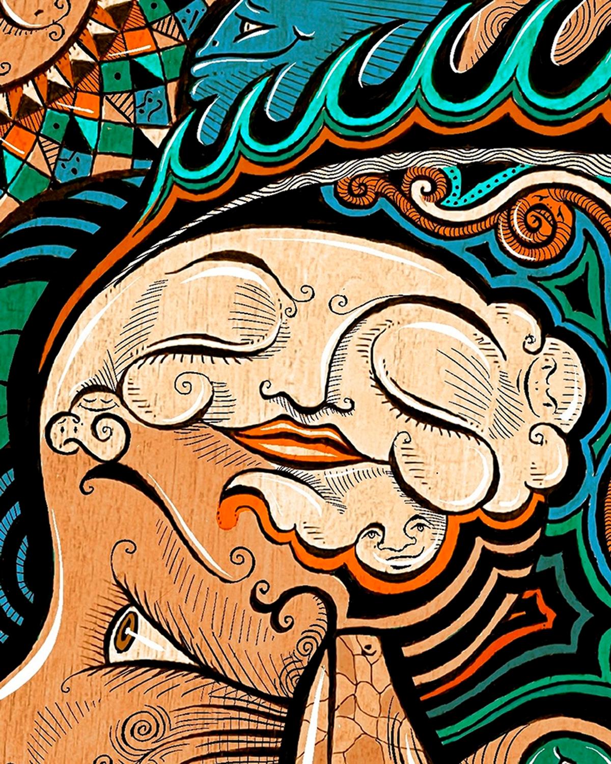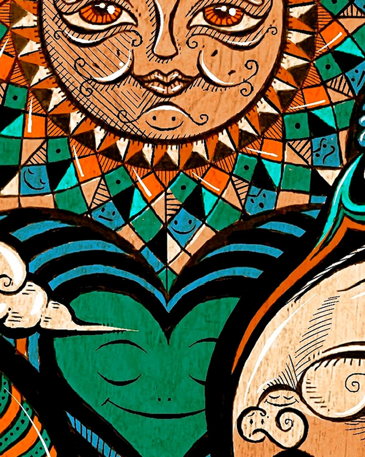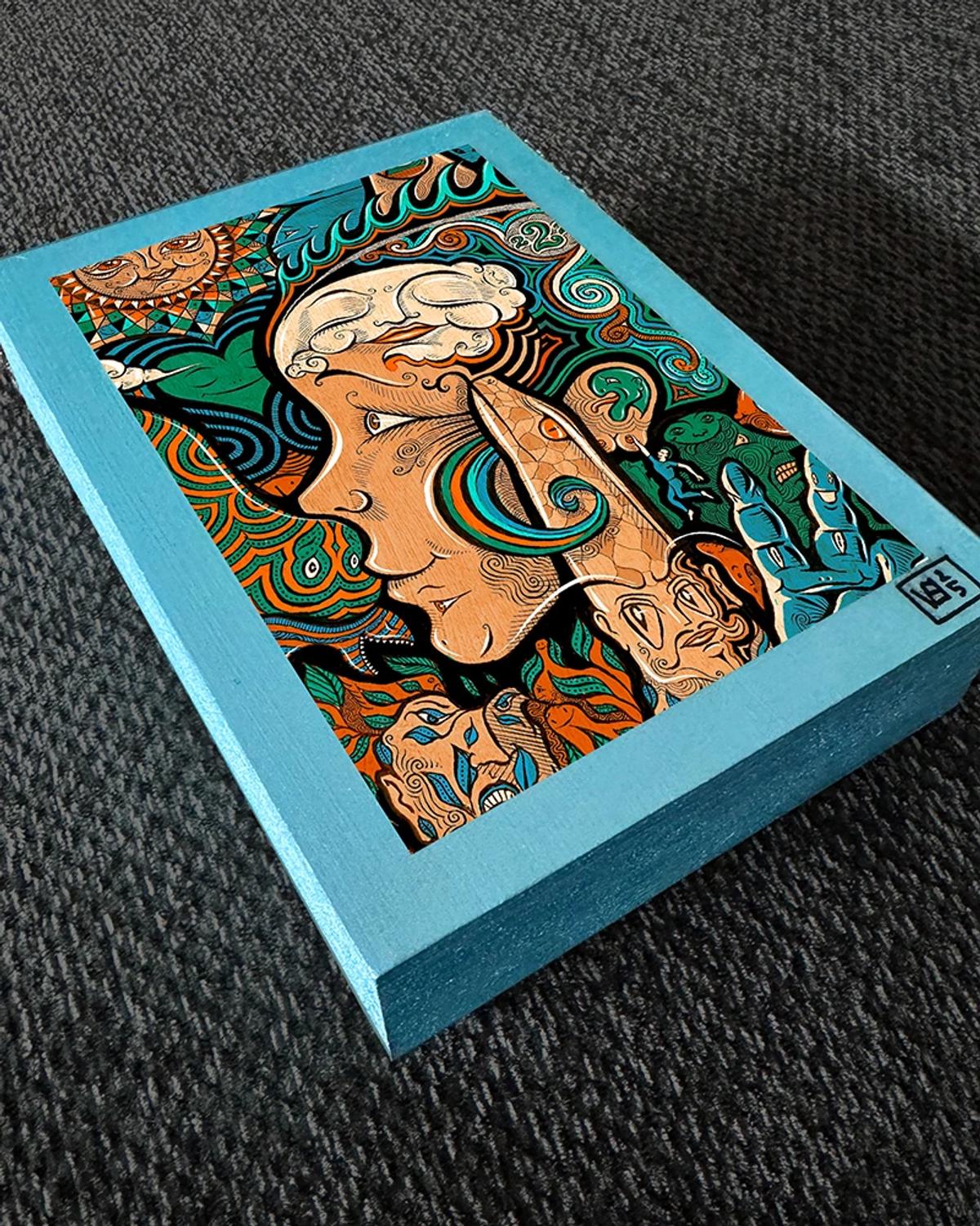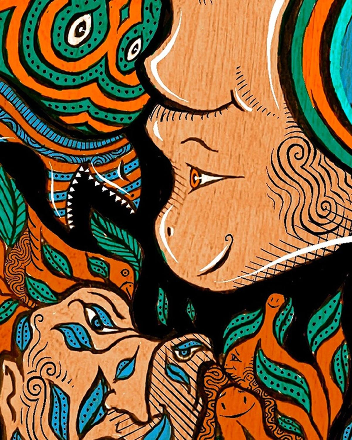 This wood-grain composition unfolds as a stream of consciousness, tracing the emotional terrain of deep connection. Faces and symbols emerge and dissolve, reflecting the tension between doubt and devotion, chaos and clarity. The piece explores the moment when attraction shifts into responsibility—when uncertainty gives way to acceptance. Rather than a singular story, the work speaks to a shared human experience: hesitation before commitment, the instinct to retreat, and the quiet return that allows love to take hold.